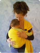 Sling amarelo, na posição Barriga com barriga